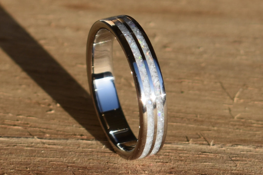 View ringHandcrafted with a custom stainless steel core, this ring features a crushed natural pearl inlay in single or double channel designs. The polished interior and smooth comfort fit balance organic beauty with modern minimalism — a perfect gift for a June birthday or 30th anniversary.