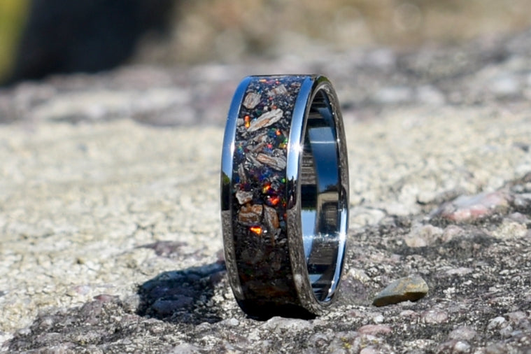 View ringCrafted from lightweight Grade 5 titanium, this ring showcases rare inlays of genuine Triceratops bone, Campo del Cielo meteorite, and deep space green opal—a striking blend of prehistoric earth and cosmic wonder.