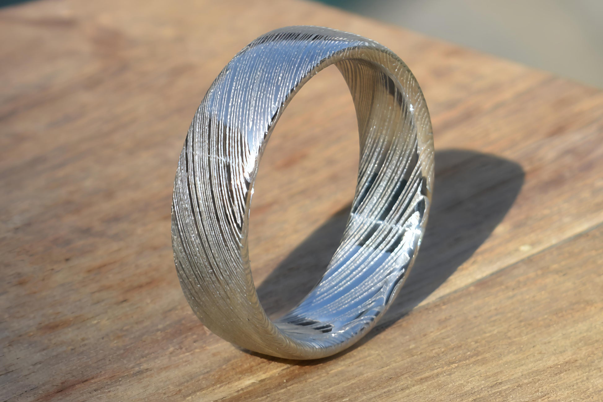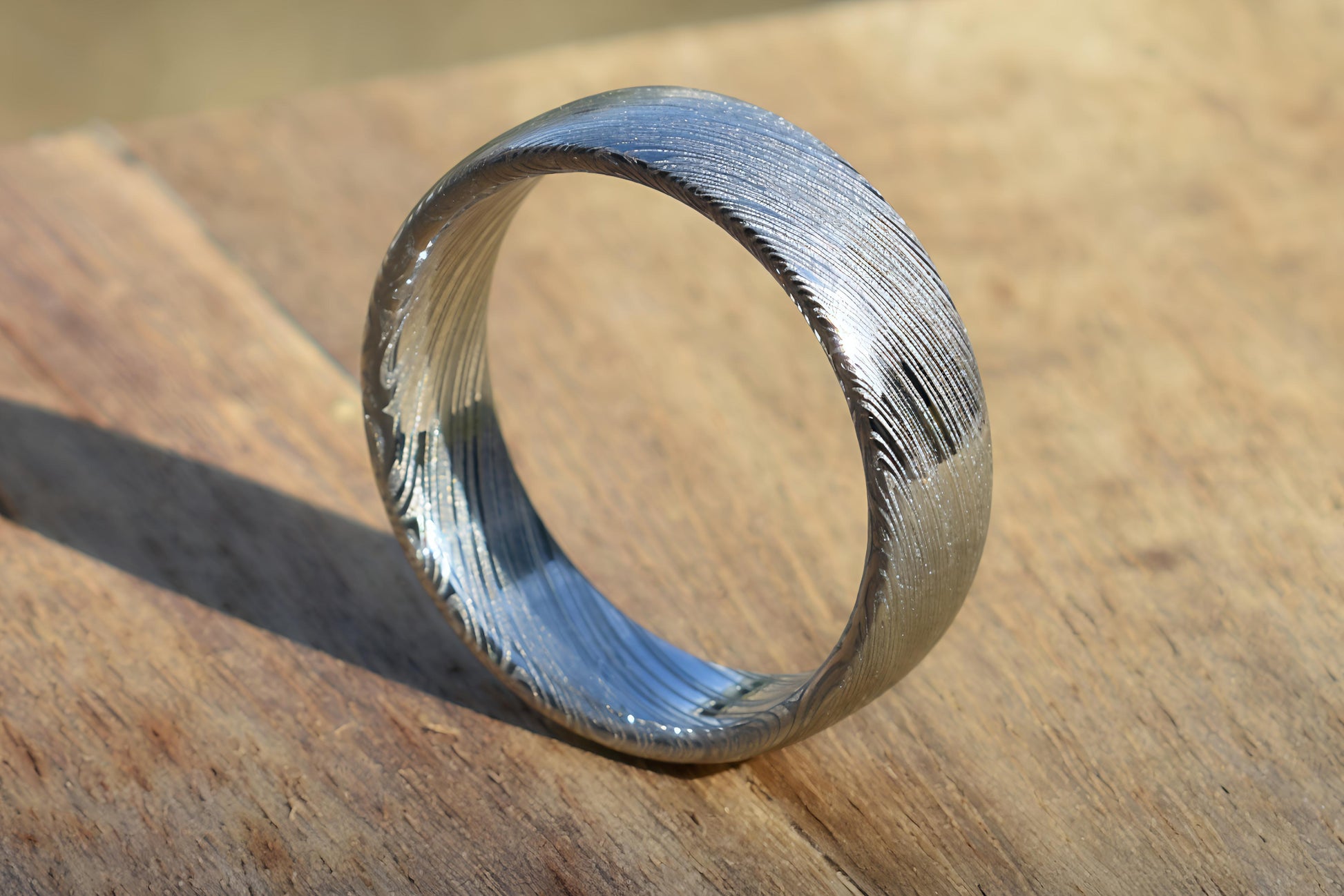 Crafted from premium Damasteel® stainless Damascus, this ring features the bold Heimskringla pattern—a dramatic, swirling grain inspired by Norse mythology and cosmic motion. With its deep, celestial curves and layered complexity, each ring becomes a wearable story of movement and mystery, perfect for those drawn to powerful symbolism and striking design.