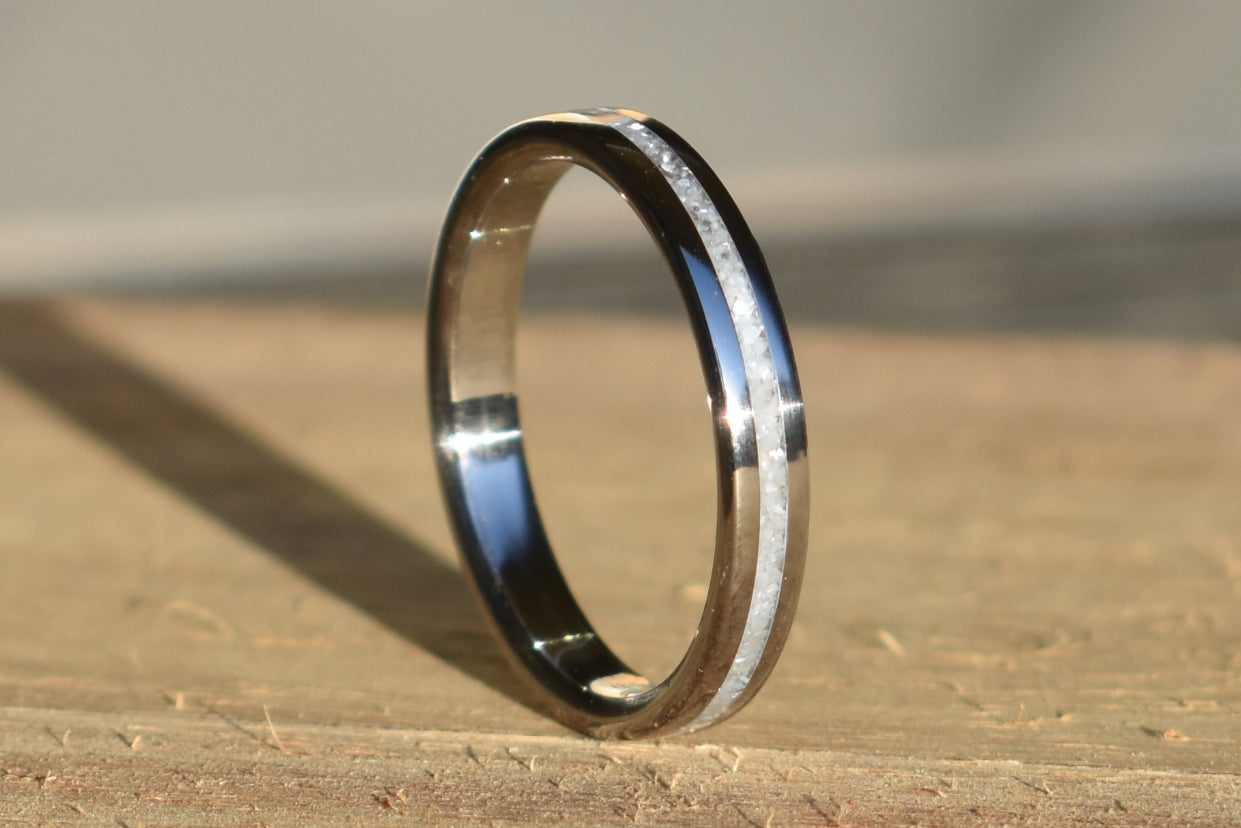 Handcrafted to order with a custom stainless steel core, this ring features a natural crushed pearl inlay that brings softness and iridescence to a sleek, modern form.